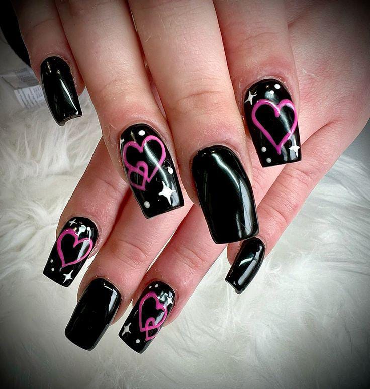 Glossy black nails feature bright pink heart outlines and subtle star accents for a striking Valentine’s look. The vibe is bold, edgy, and slightly dramatic while still romantic.