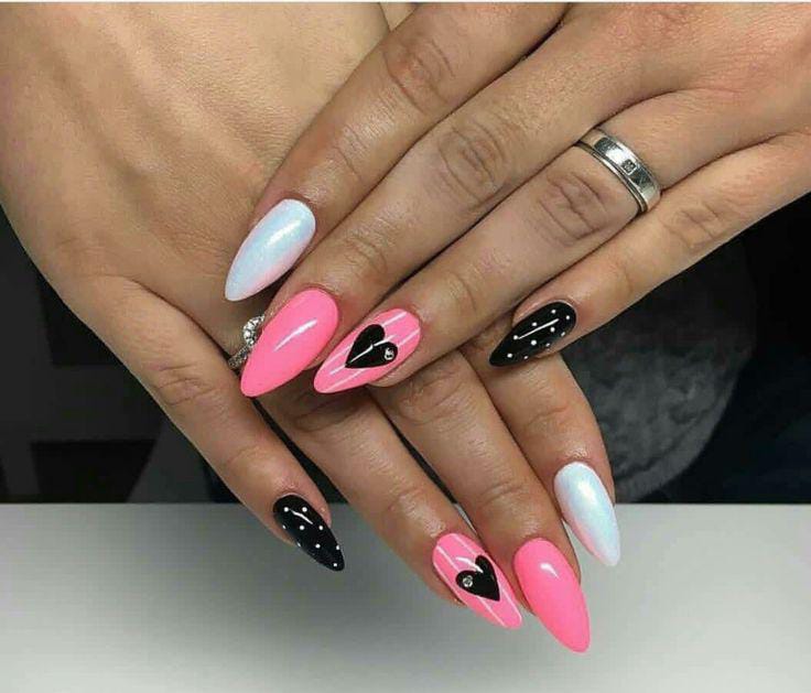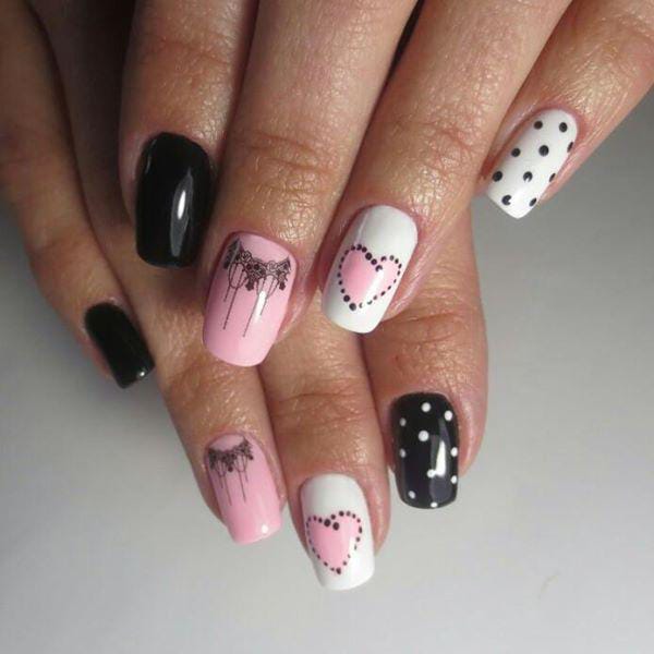 Pink, black, and white nails combine hearts, dots, and delicate details for a fun Valentine-inspired mix. The design feels playful and stylish with a charming, girly touch.