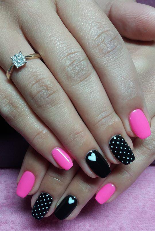 Vibrant pink nails are paired with black accent nails featuring polka dots and a single heart detail. The overall look is bold, confident, and fun with a trendy Valentine vibe.