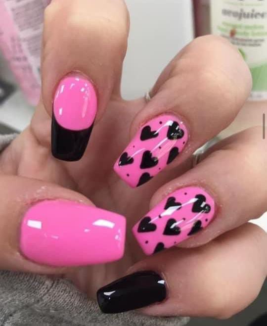 Hot pink nails are paired with black tips and scattered heart details for a fun, flirty Valentines. The glossy finish keeps the design youthful and eye-catching.