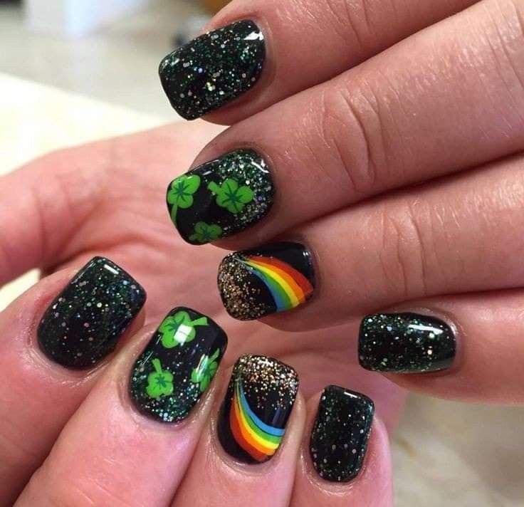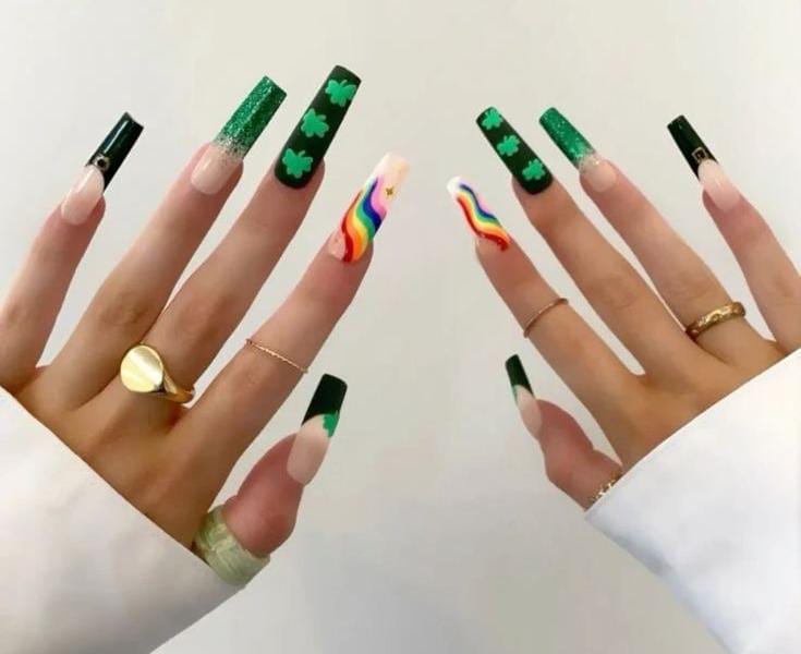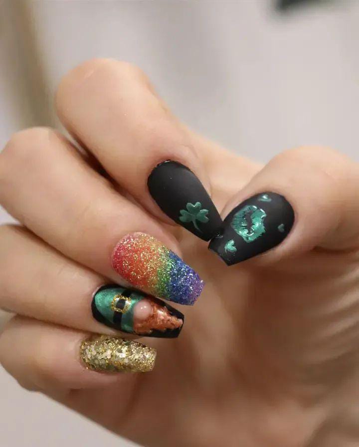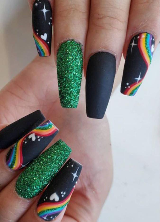 This design mixes matte black nails with bright rainbow swirls, dots and tiny star-like accents for a magical, night-sky vibe. The green glitter nails add a bold St. Patrick’s Day pop while keeping the overall look edgy and festive.