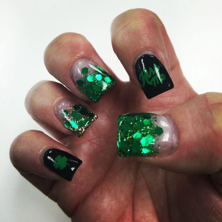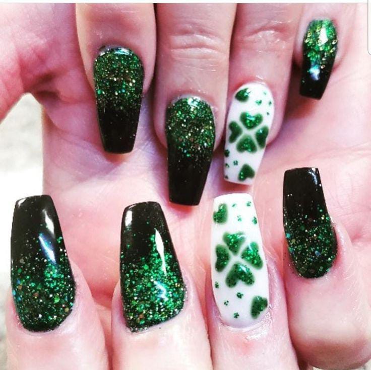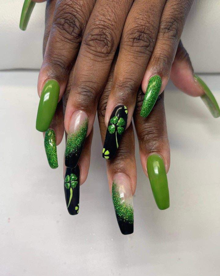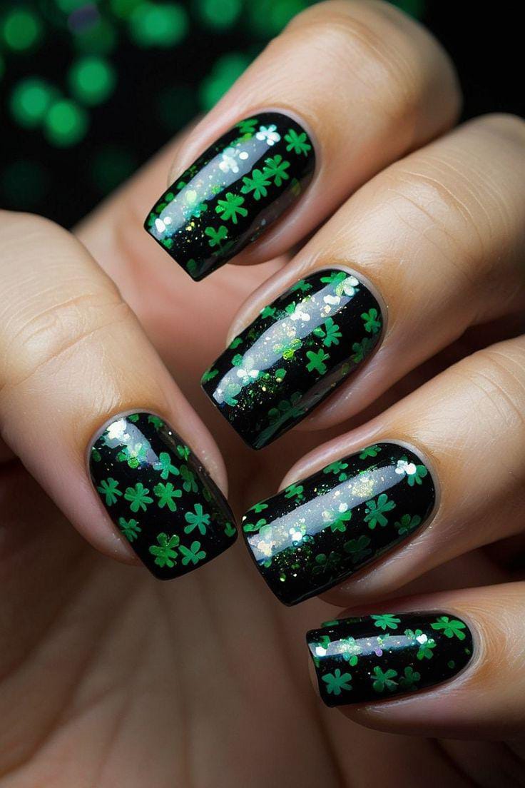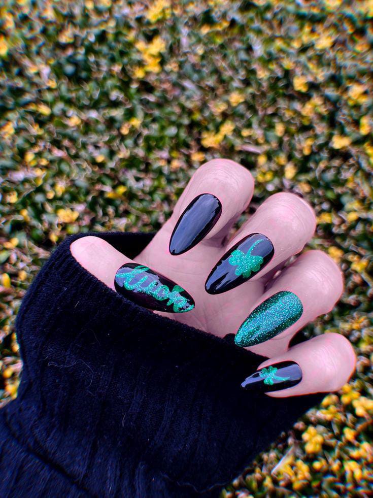 This bold set mixes matte black nails with heavily textured black and green glitter accents. The contrast between smooth and sparkly finishes creates a dramatic, high-fashion St. Patrick’s Day look.