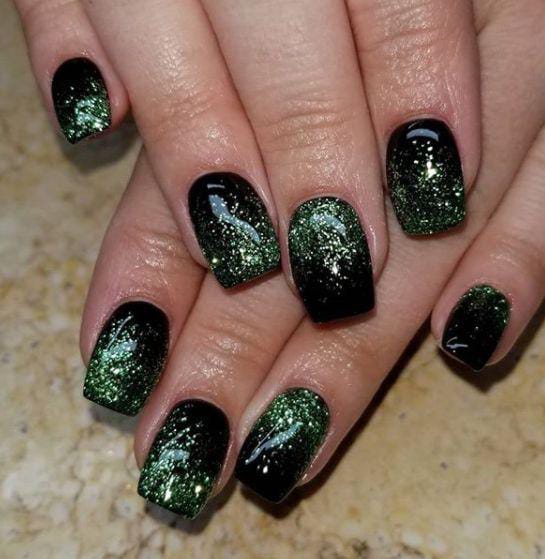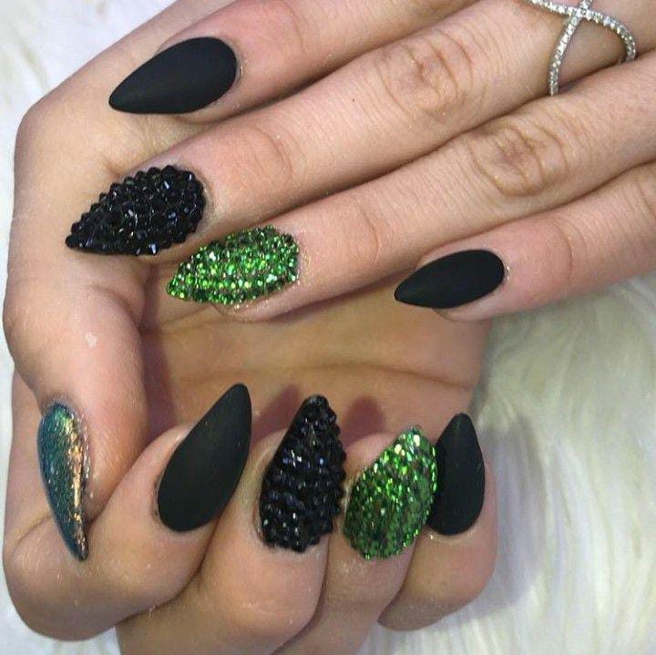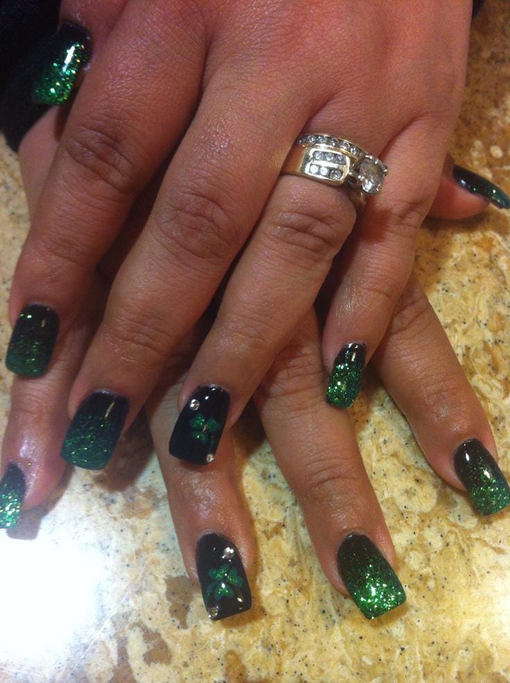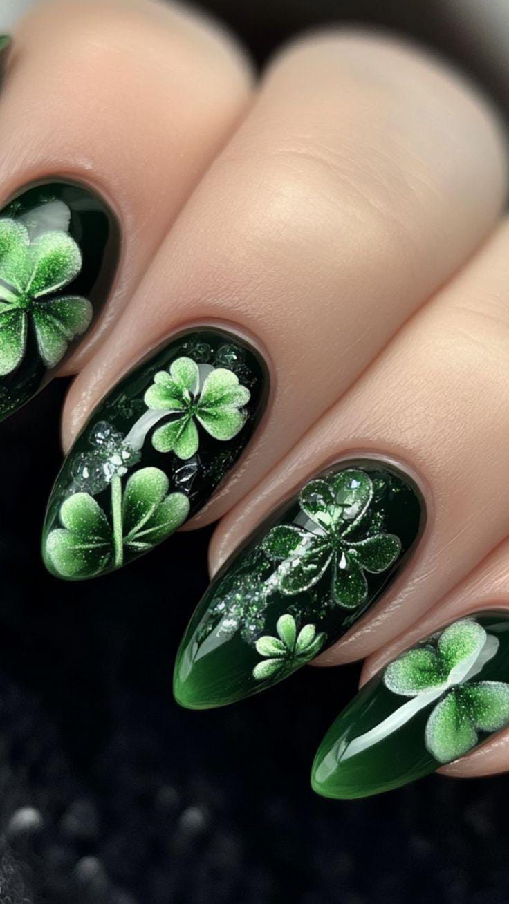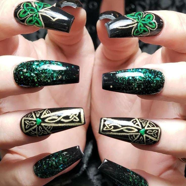 This bold set mixes matte black nails with heavily textured black and green glitter accents. The contrast between smooth and sparkly finishes creates a dramatic, high-fashion St. Patrick’s Day look.