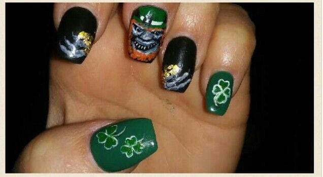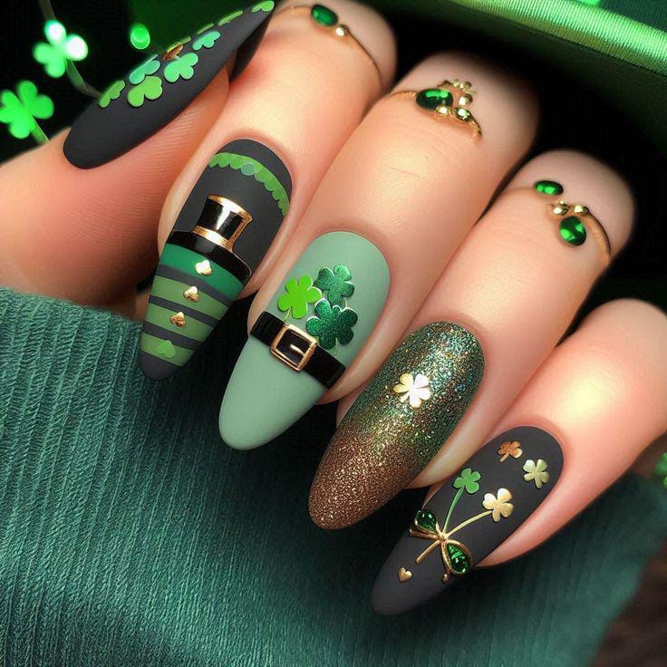 A mix of black and green nails with shamrocks, gold accents, and a playful leprechaun character creates a fun holiday set. The overall style is festive, bold, and full of St. Patrick’s Day spirit.