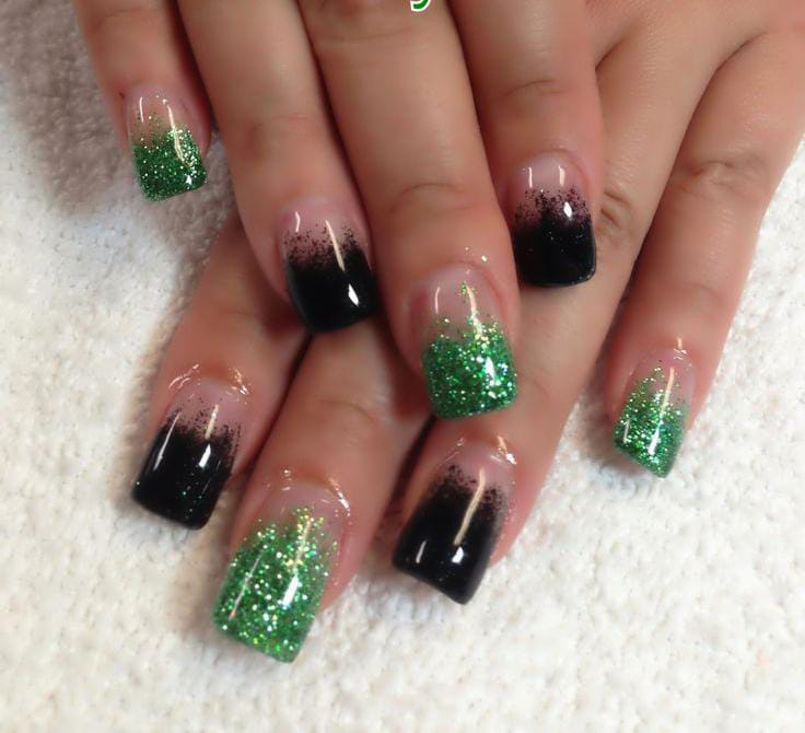 This design blends glossy black with sparkling emerald green in a soft gradient. The glitter gives it a magical, night-sky vibe with a bold St. Patrick’s Day twist.