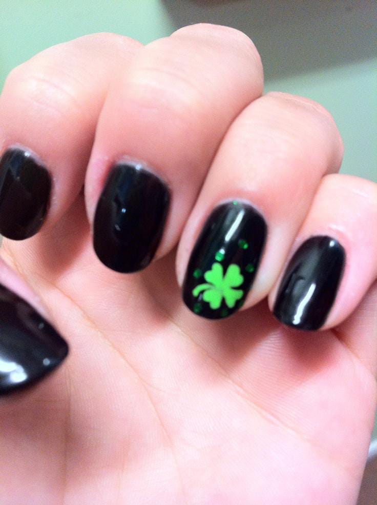 Sleek black glossy nails are paired with soft green clover accents for a clean, modern look. The overall style feels minimal but festive, perfect if you want something subtle with a St. Patrick’s Day touch.