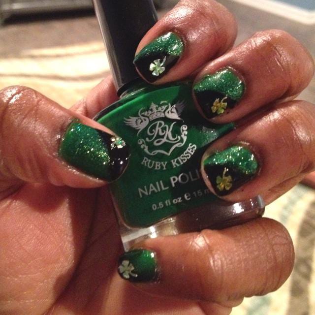 A deep green glitter base with black tips and tiny shamrock accents for a classy, festive look. The overall vibe is elegant with a subtle St. Patrick’s Day twist.