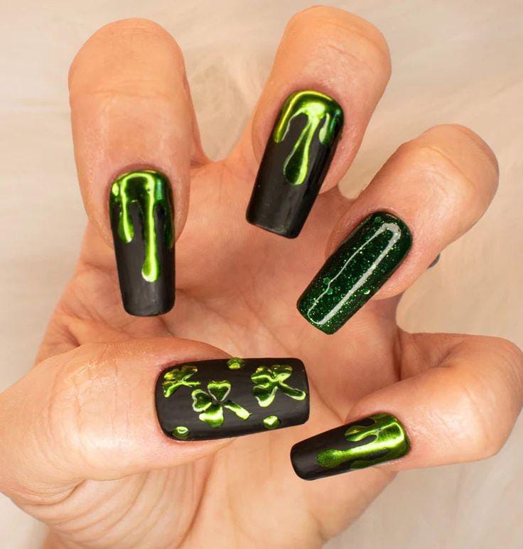 Matte black and shimmer nails feature metallic green drip effects and shamrock dot details that look edgy and playful St. Patrick’s Day. The vibe is modern, fun, and a little spooky in a cool way.
