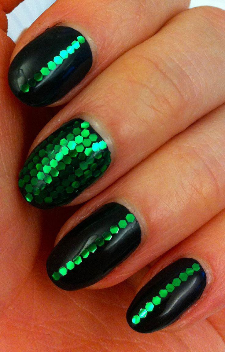 Glossy black nails are paired with bright green hexagonal glitter accents that resemble dragon scales. The look is sleek, eye-catching, and gives off a magical, fantasy-inspired St. Patrick’s Day vibe.