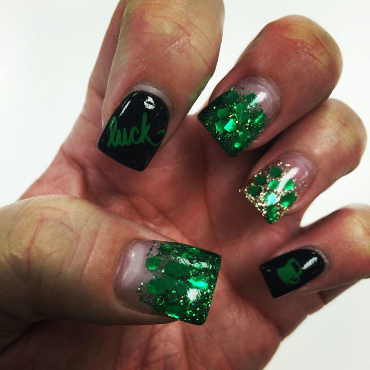 This set mixes black nails with chunky green glitter nude and playful St. Patrick’s Day accents. The overall look is fun, festive, and bold, love, perfect for celebrating with sparkle.