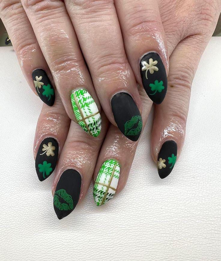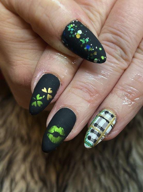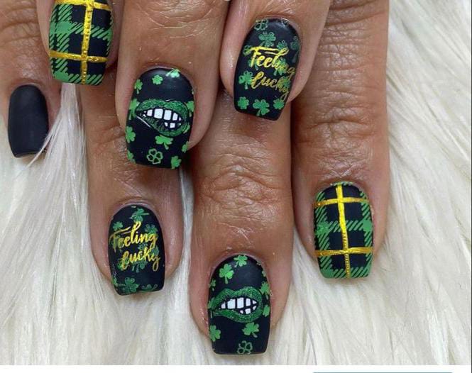 This design mixes matte black nails with green and gold plaid patterns, shamrocks, and playful “feeling lucky” lip details. It feels festive, trendy, and full of Irish-inspired St. Patrick’s Day charm.