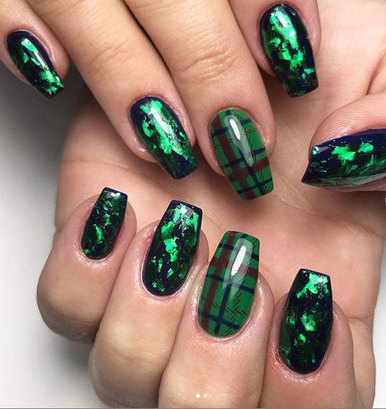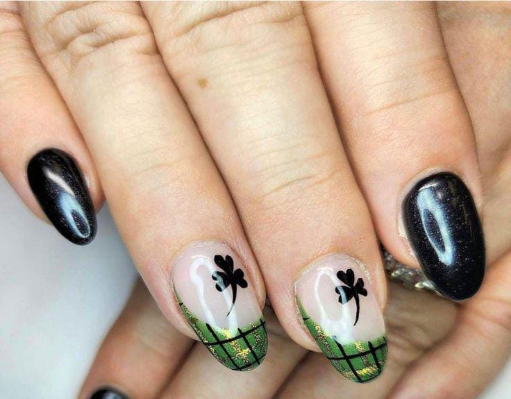 This set blends black nails with green foil textures and a plaid accent nail for variety. The look feels modern, bold, and perfect for a festive yet fashionable St. Patrick’s Day style.