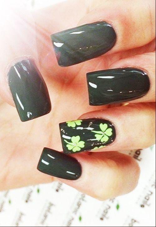 Deep black nails are paired with soft green clover-style floral designs for a clean, festive contrast. The look is simple but striking, with a classy St. Patrick’s Day vibe that still feels wearable.