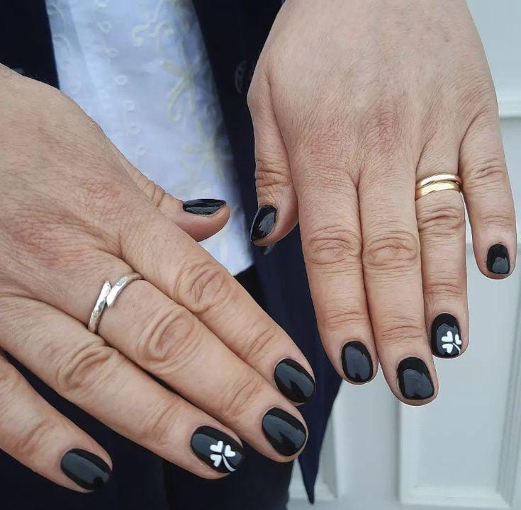 Classic black nails are decorated with tiny white clover details for a neat and understated design. The vibe is elegant and wearable, great for everyday St. Patrick’s Day nails.