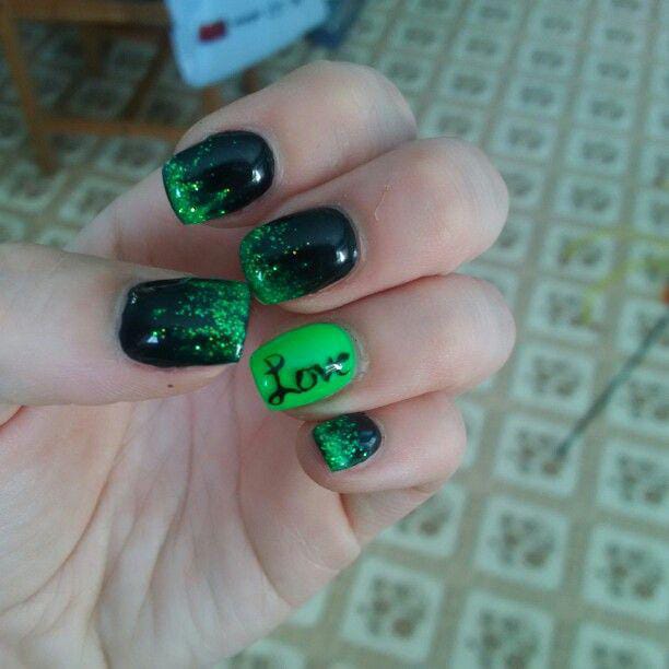 Glossy black nails are paired with deep green sparkle tips for a rich, festive contrast. The bright green accent nail with simple writing love and a tiny St. Patrick’s Day charm gives the set a cute, personal vibe.