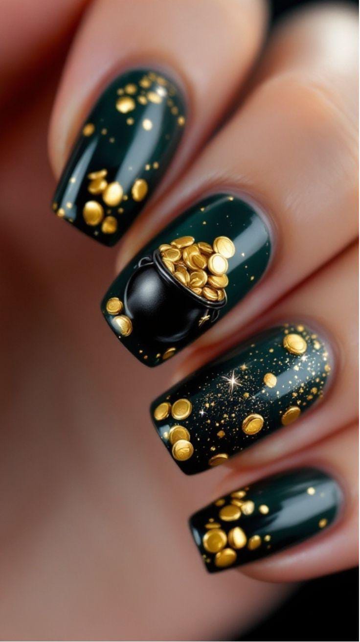 Glossy black nails are decorated with shiny gold coin pots and tiny gold spackle details and sparkly accents for a rich, magical look. The design feels luxurious and playful, perfect for a bold St. Patrick’s Day statement.