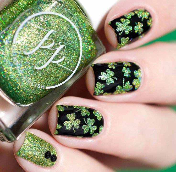This design blends black polish with sparkling green glitter for a classy holiday look. Small clover accents add a subtle St. Patrick’s Day touch without overpowering the style.