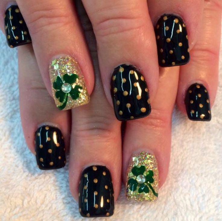 Black nails with soft gold polka dots create a chic, elegant base, while the gold glitter accent nails with green shamrocks, gemstone add a festive twist. The overall look feels classy, cute, and perfect for a dressed-up St. Patrick’s Day style.