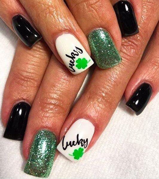 Black and white nails are paired with a glittery green accent for a festive pop of color. The small clover details and “lucky” text give it a fun, celebratory St. Patrick’s Day fee