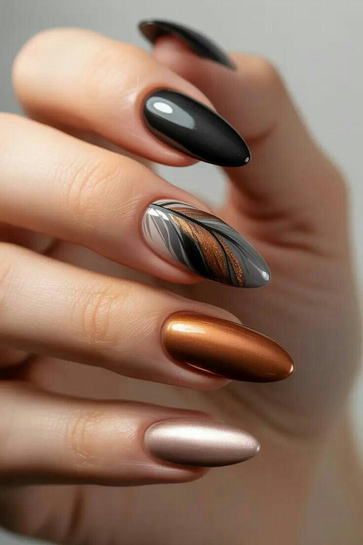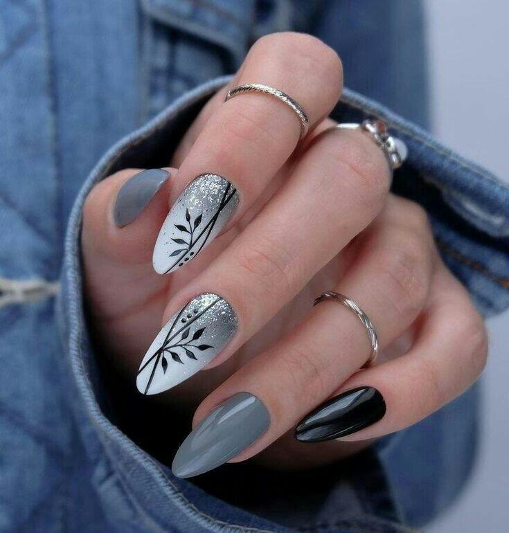 This set pairs cool gray and black nails with shimmering silver accents and simple black leaf designs. It’s sleek and frosty with a polished, wintry elegance.