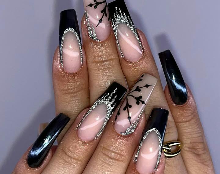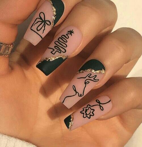 A blend of matte black and nude tones decorated with fine botanical line art creates a delicate, minimalist winter look. It’s subtle, modern, and perfect for those who prefer a softer take on seasonal nails.