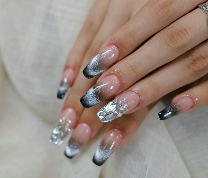 This look features long, glossy nails with a black-to-silver-to-nude gradient that creates a frosty winter effect. The large crystal accents add a bold, icy sparkle, giving the set a glamorous, high-shine finish.