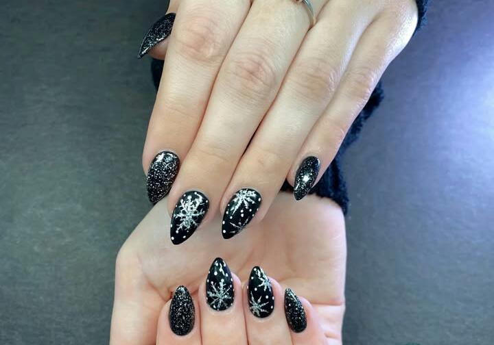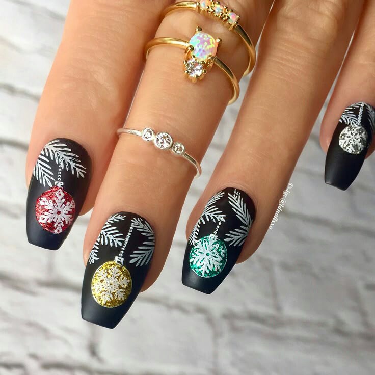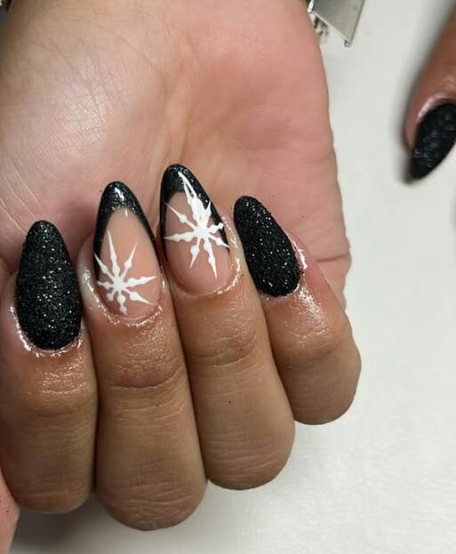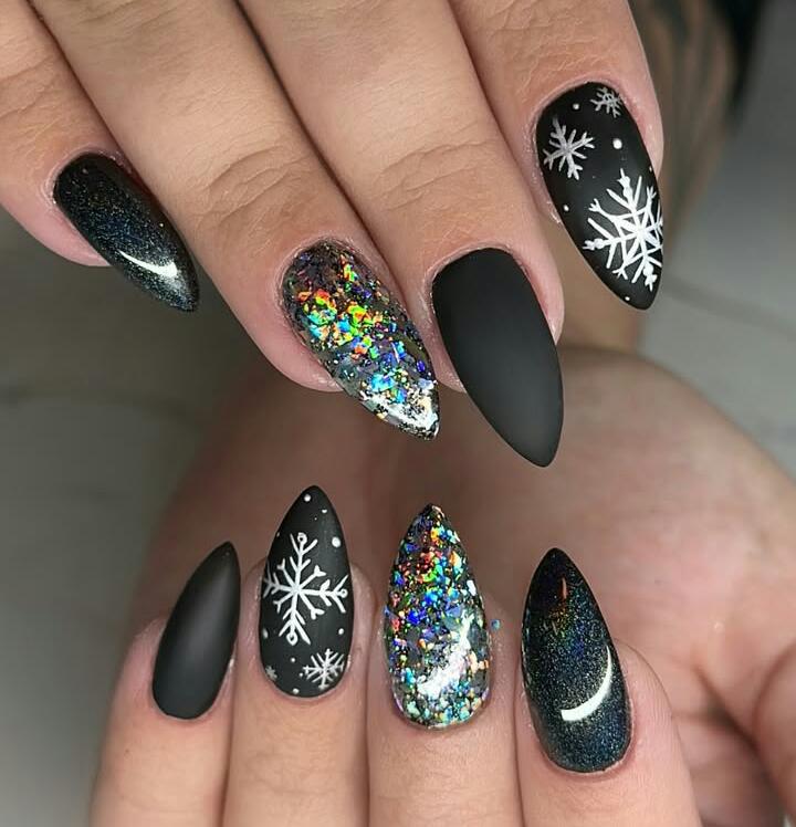 These almond-shaped nails use matte black, glittery holographics, and delicate snowflake designs to create a winter-night feel. The mix of textures adds depth, making the look both festive and dramatic.