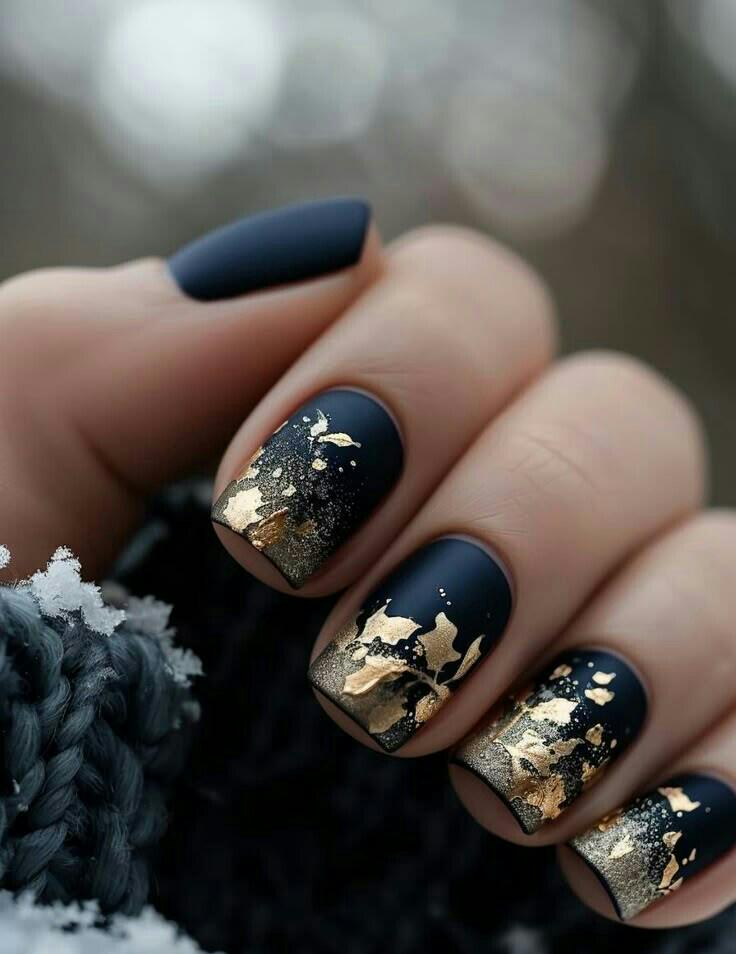 This design features matte black nails accented with bold gold foil at the tips, giving a rich wintery contrast. It has a luxurious, textured look that feels both dramatic and elegant for the season.