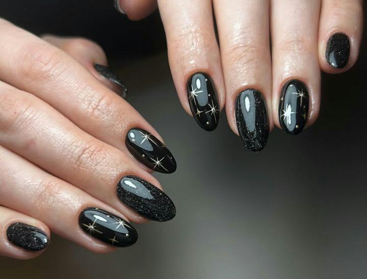 This design features glossy black nails paired with sparkling gold accent nails topped with bold black stars. The vibe is festive, sleek, and perfect for a chic winter night look.