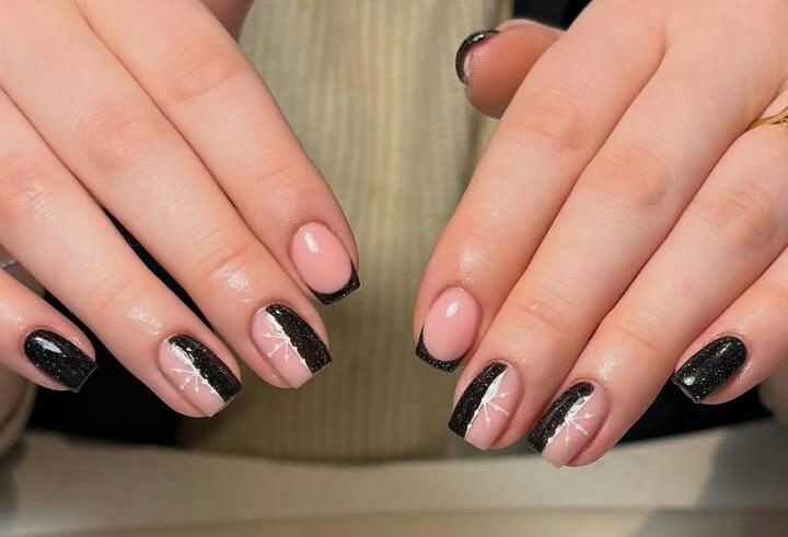 This design mixes nude pink with shimmering black tips and fine line detailing. It feels polished and festive, with a soft contrast that works beautifully for winter.