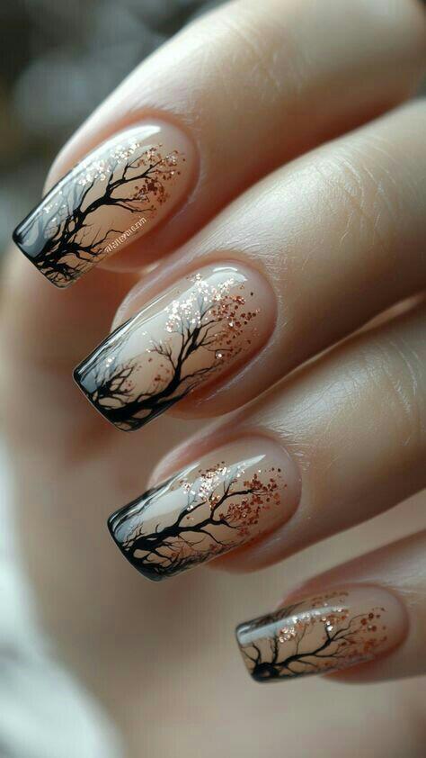 Soft nude polish paired with delicate black tree-branch silhouettes and glitter creates a calm, wintry forest feel. Subtle glitter gives it a frosted, snowfall-like shimmer.