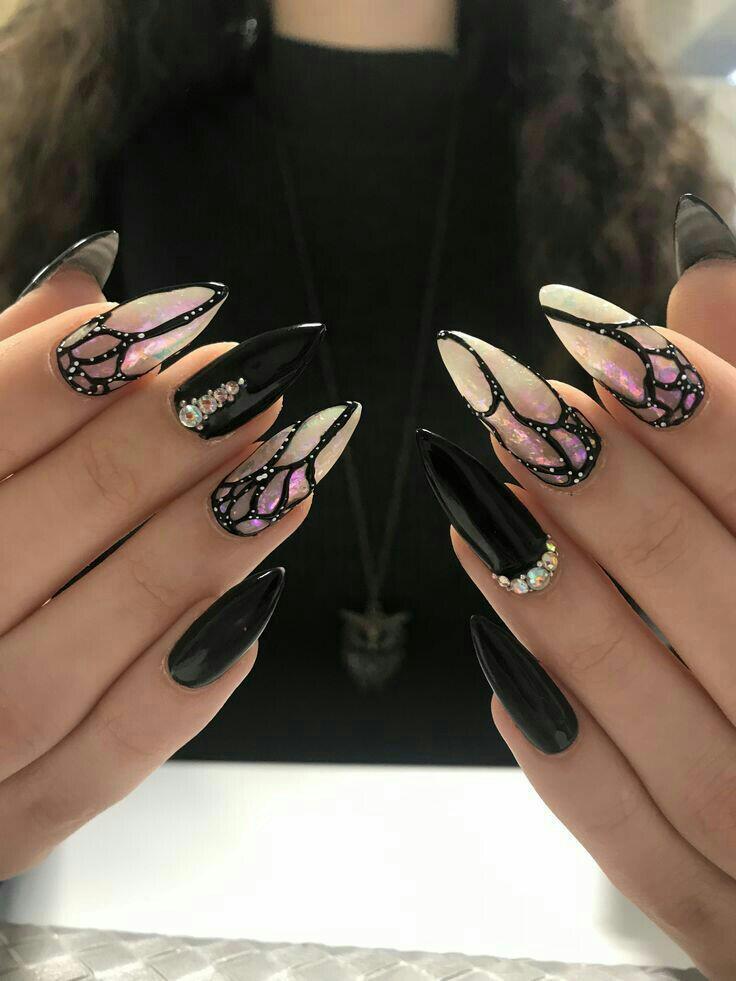These nails mix deep black polish with shimmering, opal-like accents framed by wing-style black outlines. The overall effect is dramatic and magical, perfect for a winter fantasy aesthetic.