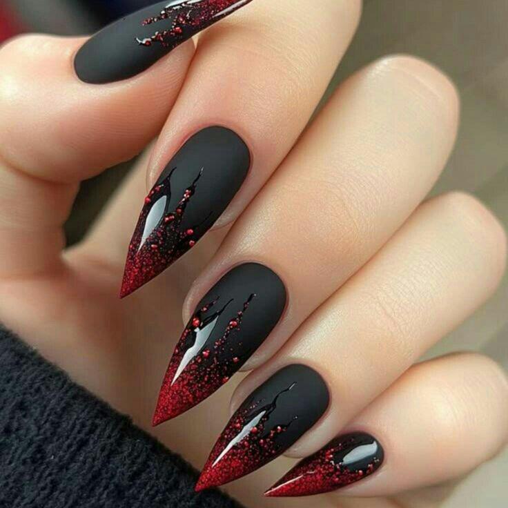 A matte black base is paired with glossy, glittery red tips that appear to drip downward. The contrast creates a striking, edgy winter look with a touch of dark glamour.