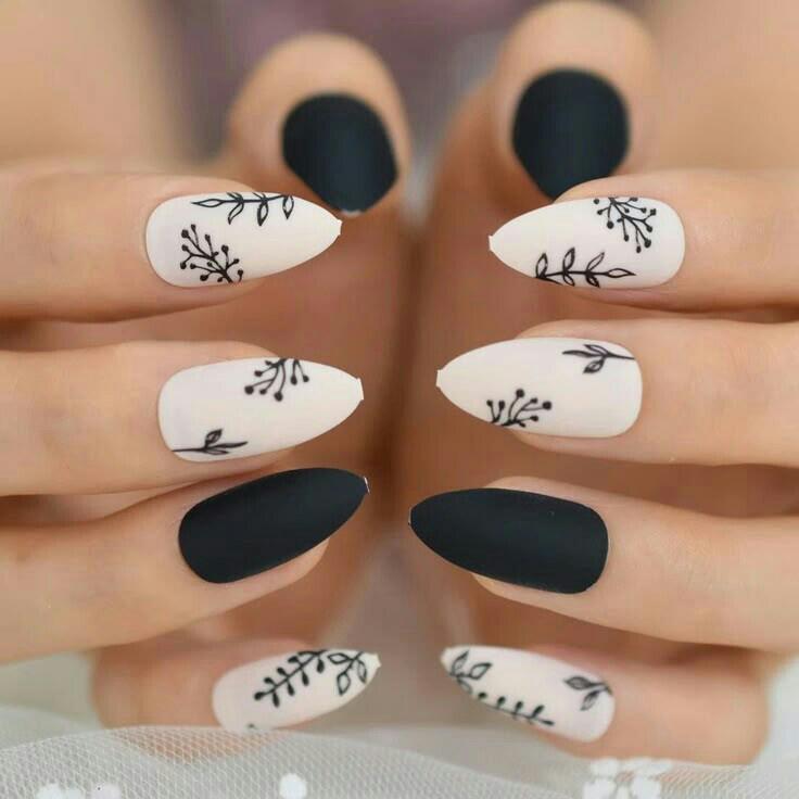 This design pairs matte black nails with soft, creamy white ones decorated with simple black botanical line art. It feels minimal, cozy, and winter–chic without being too bold.