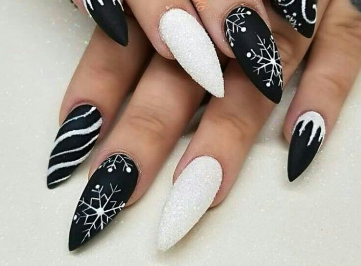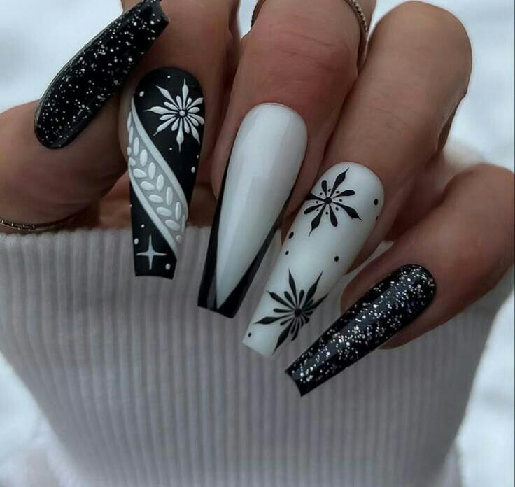 These matte black and textured white nails mix snowflakes, icy drips, and soft sugar-glitter finishes. The combination feels wintry and cozy, with a dramatic but elegant edge.