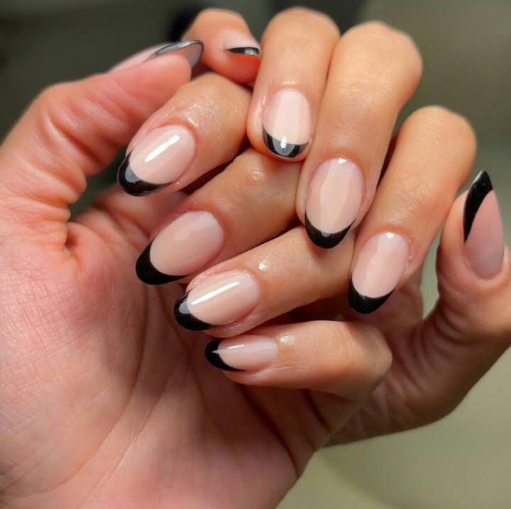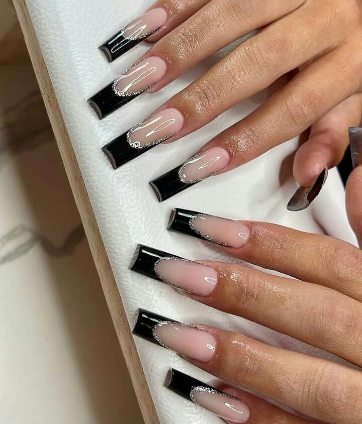 A modern twist on the French tip, these nails feature glossy black ends with a soft nude base and a subtle silver outline. The design is sleek, polished, and winter-ready.