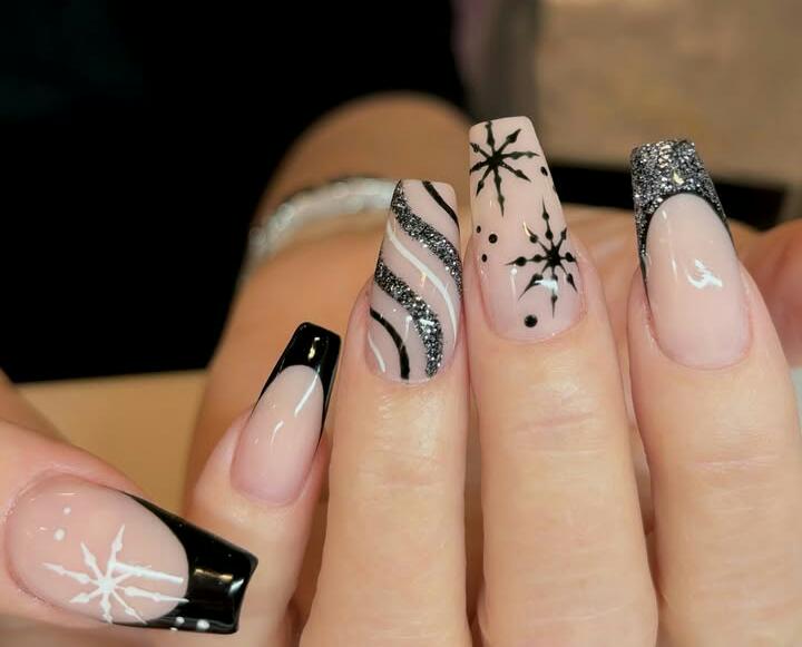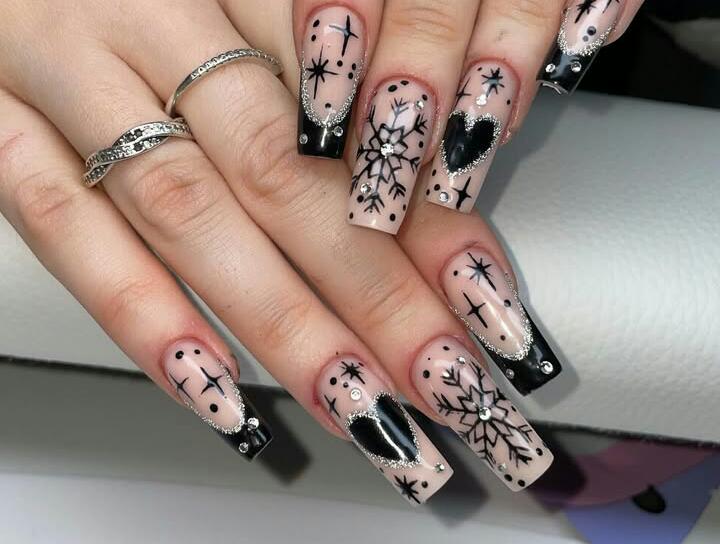 These long nails combine nude and black with delicate snowflakes, tiny stars, and glittering accents. The added rhinestones give it a frosty, glamorous winter energy.