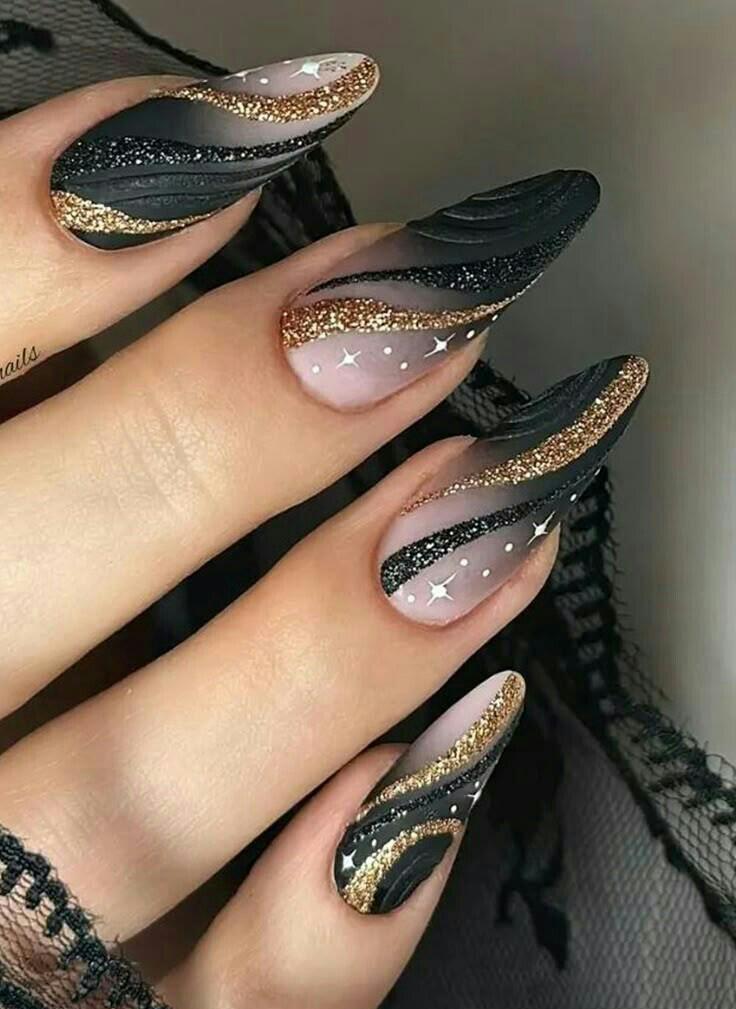 These nails blend matte and glossy black with soft nude tones, highlighted by gold and silver glitter swirls. The flowing lines and tiny star accents create a dreamy, wintry galaxy effect.