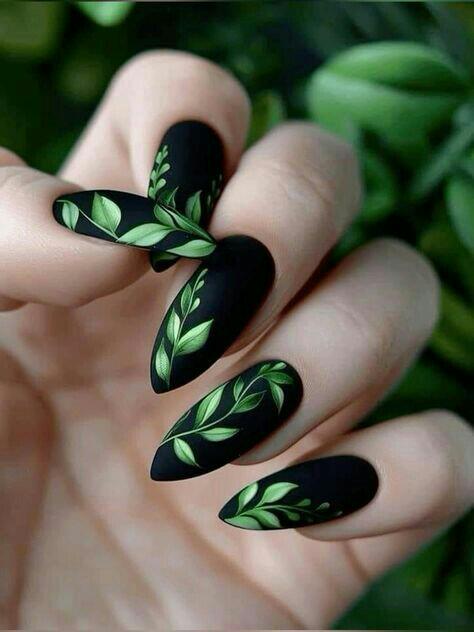 Matte black nails become a dramatic backdrop for hand-painted green leafy patterns. The look is bold yet natural, giving an enchanted-forest-in-winter feel.