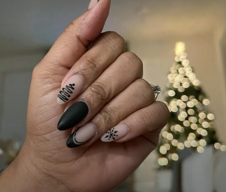 This design mixes matte black nails with soft nude tones and simple black line art. The look feels clean, modern, and winter-ready with subtle holiday-inspired accents like a delicate snowflake and abstract squiggles.