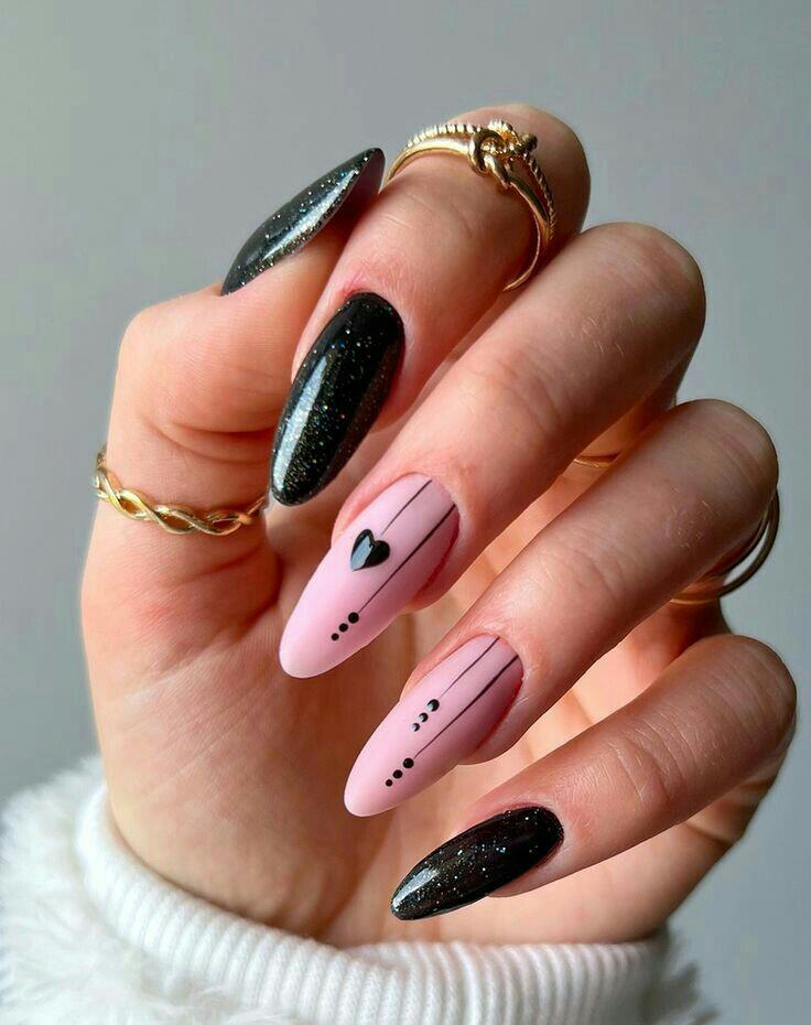 These nails blend glossy black sparkles with matte pink nails decorated with thin lines and a tiny heart. The vibe is cute and edgy at the same time, great for winter but still playful.