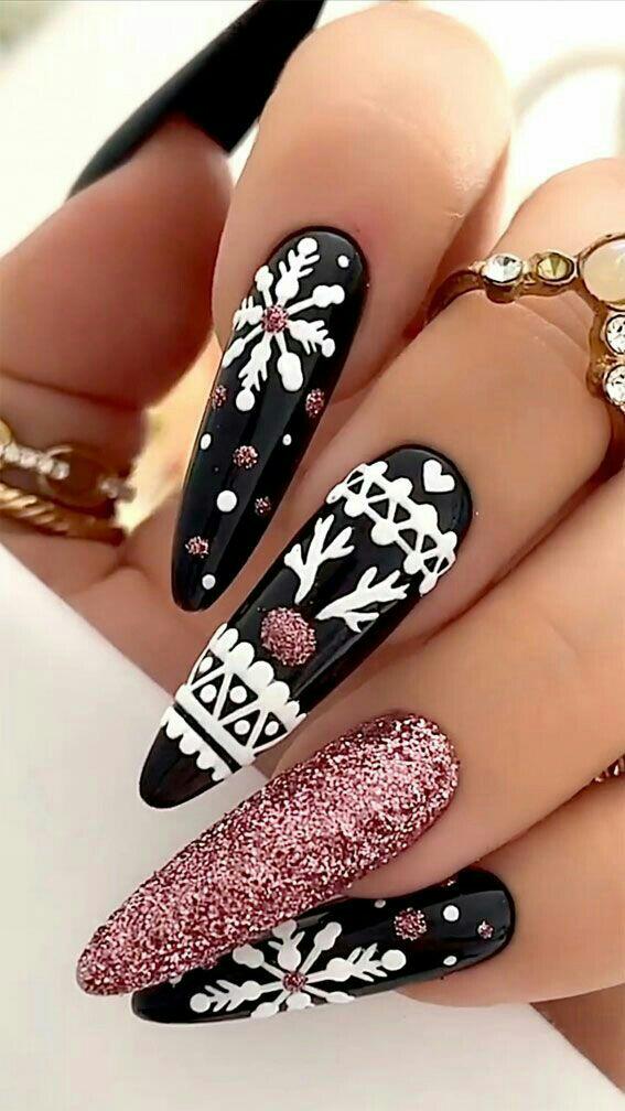 This set features deep black nails covered in bright white snowflakes and cozy sweater-style patterns, paired with a striking rose-gold glitter accent nail. It has a bold, festive winter feel with plenty of texture and shine.