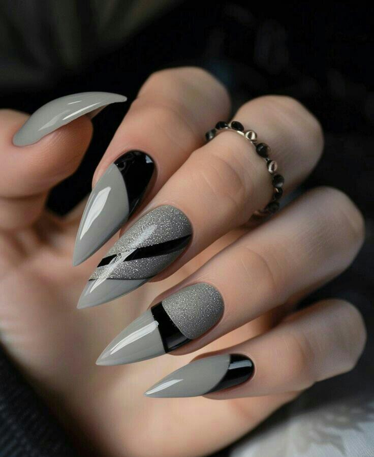 These nails combine shades of grey with black accents and a touch of fine silver glitter. The sharp, angular designs give it a modern, icy winter vibe without being overly seasonal.