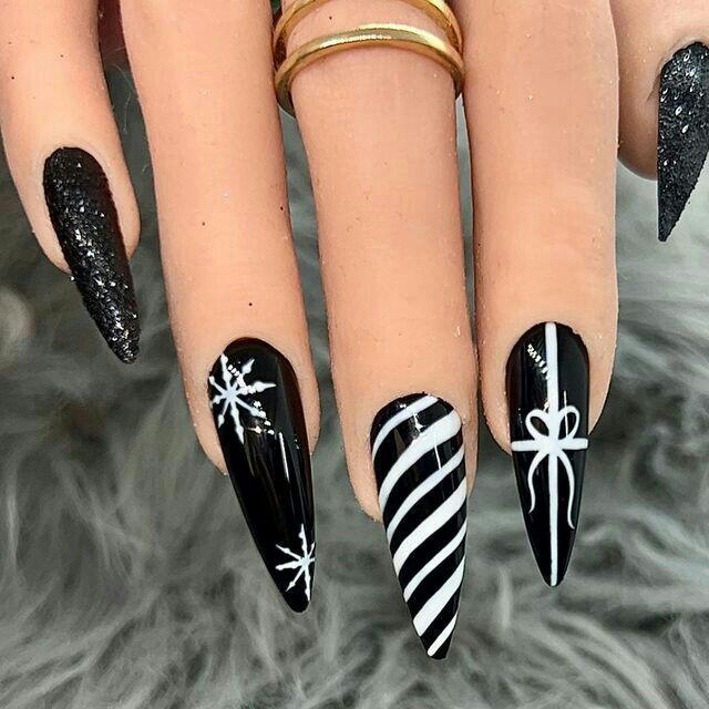 This design features long, sharp black nails accented with crisp white snowflakes, ribbon and candy-stripe patterns. The look is bold, festive, and high-contrast, giving off a chic winter-night vibe.