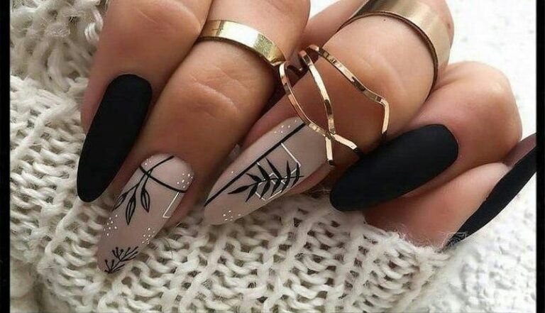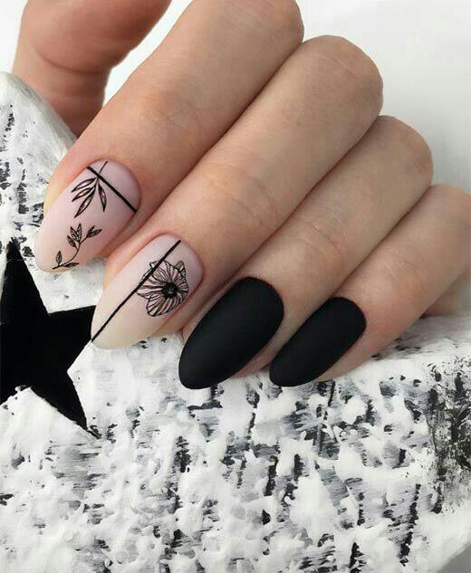 This design mixes matte black nails with soft nude accents, decorated with simple black leaf line art. It feels cozy yet modern, giving a minimal winter-botanical vibe.