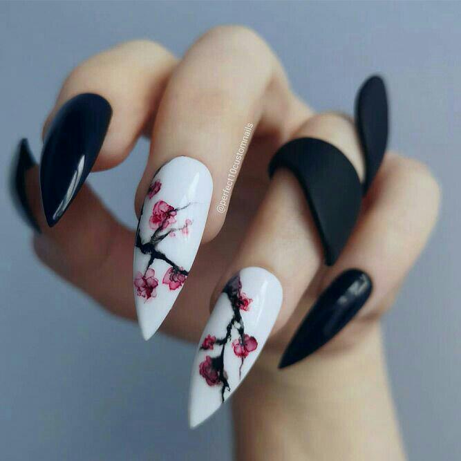 Bold black nails contrast with white accent nails painted with delicate cherry blossom branches. The look blends winter minimalism with a soft, artistic floral touch.