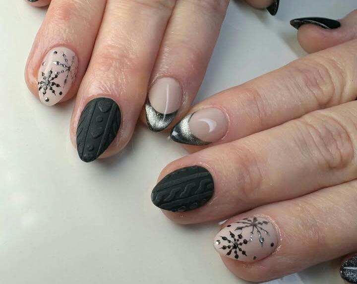 This design blends matte black “sweater texture” nails with soft nude nails featuring delicate black snowflakes. Silver-tipped accents add a frosty winter touch.