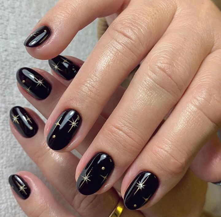 Glossy black nails are sprinkled with tiny gold stars and dots, giving the look of a crisp winter night sky. It’s simple, elegant, and striking.