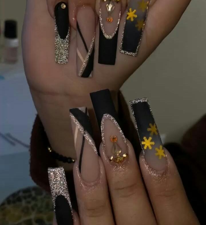 This set mixes bold black sections with nude bases, topped with silver glitter and gold accents for a dramatic winter look. The long coffin shape and scattered gems give it a luxe, festive vibe.