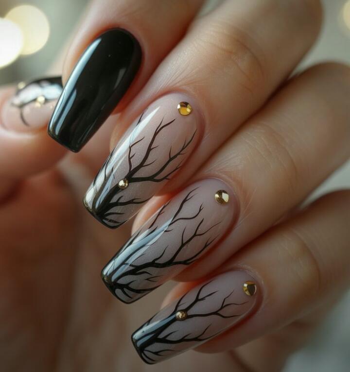 These nails feature a soft nude base with fine black branch-like designs that create a moody, wintry forest feel. The single solid-black nail and tiny gold studs add a sleek, elegant touch.